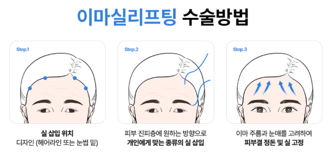 | 효과 | 눈썹 리프팅, 이마 주름 완화 | 눈꺼풀 개선, 시야 확보 |