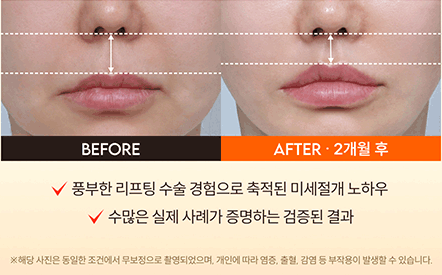 - **1개월:** 흉터 흐릿해짐 / 자연스러운 인중 라인 완성